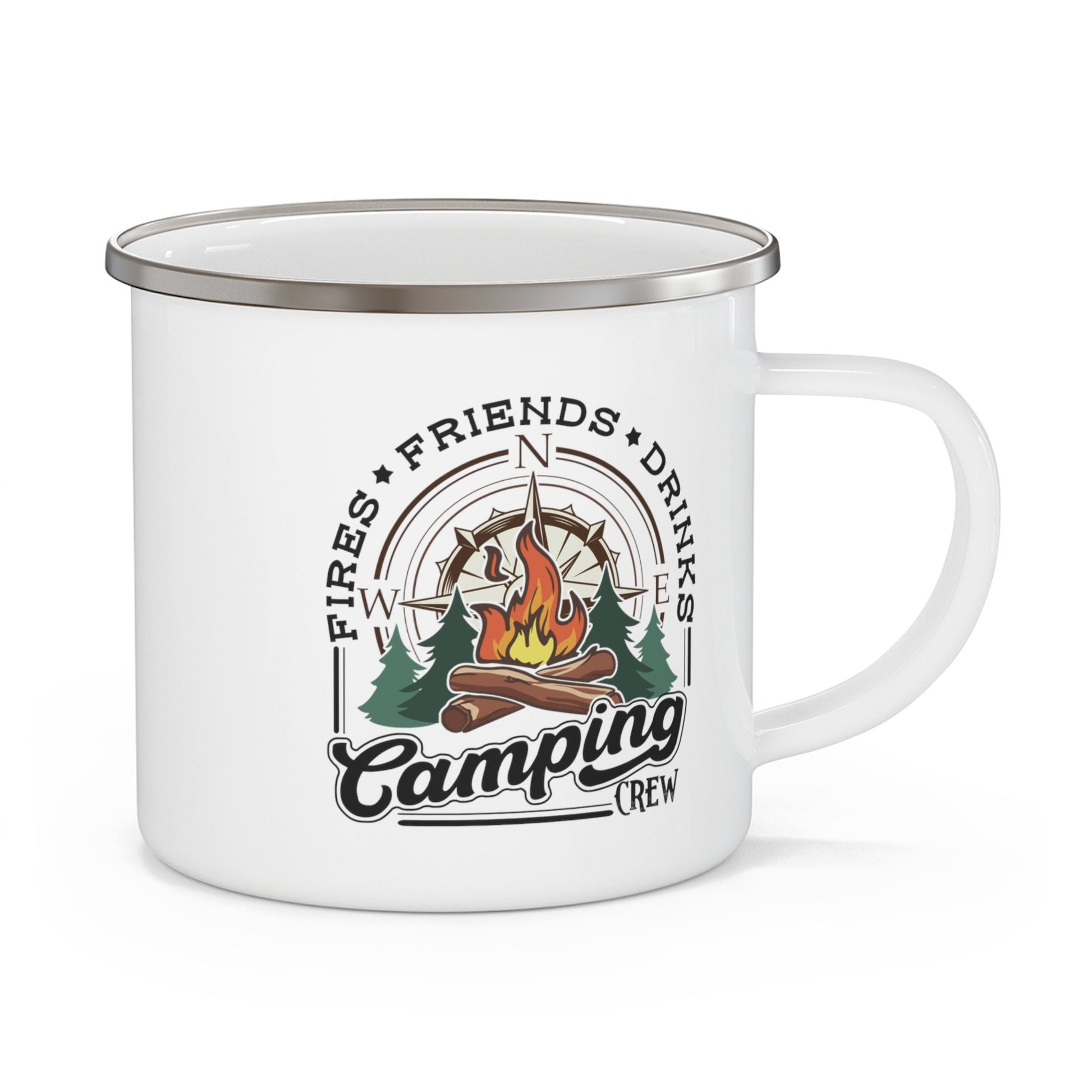 Introducing our enamel camp mug, the perfect companion for outdoor enthusiasts and adventure seekers. Crafted from durable stainless steel, this 12-ounce mug is designed to withstand rugged camping conditions while retaining its quality and functionality. With a captivating aesthetic, it features a unique design merging a campfire and a compass rose, symbolizing the spirit of exploration and camaraderie. The mug proudly showcases the slogan "Fire. Friends. Drinks" and "Camping Crew," encapsulating the essence of memorable outdoor experiences shared with friends. Whether you're sipping a hot beverage by the campfire or enjoying a refreshing drink on a hiking trail, this camp mug is an excellent choice for those who value the connections made and cherished during outdoor adventures.