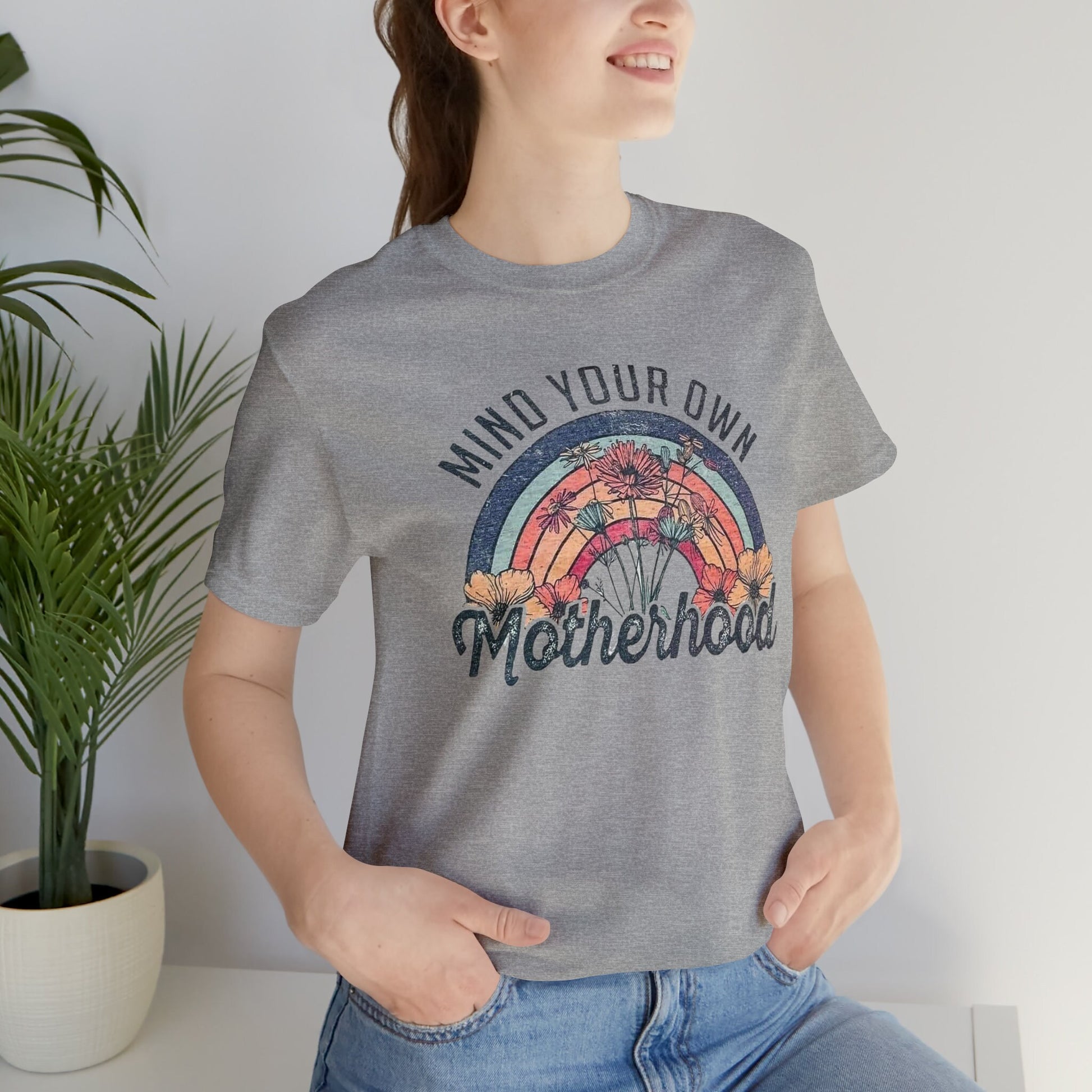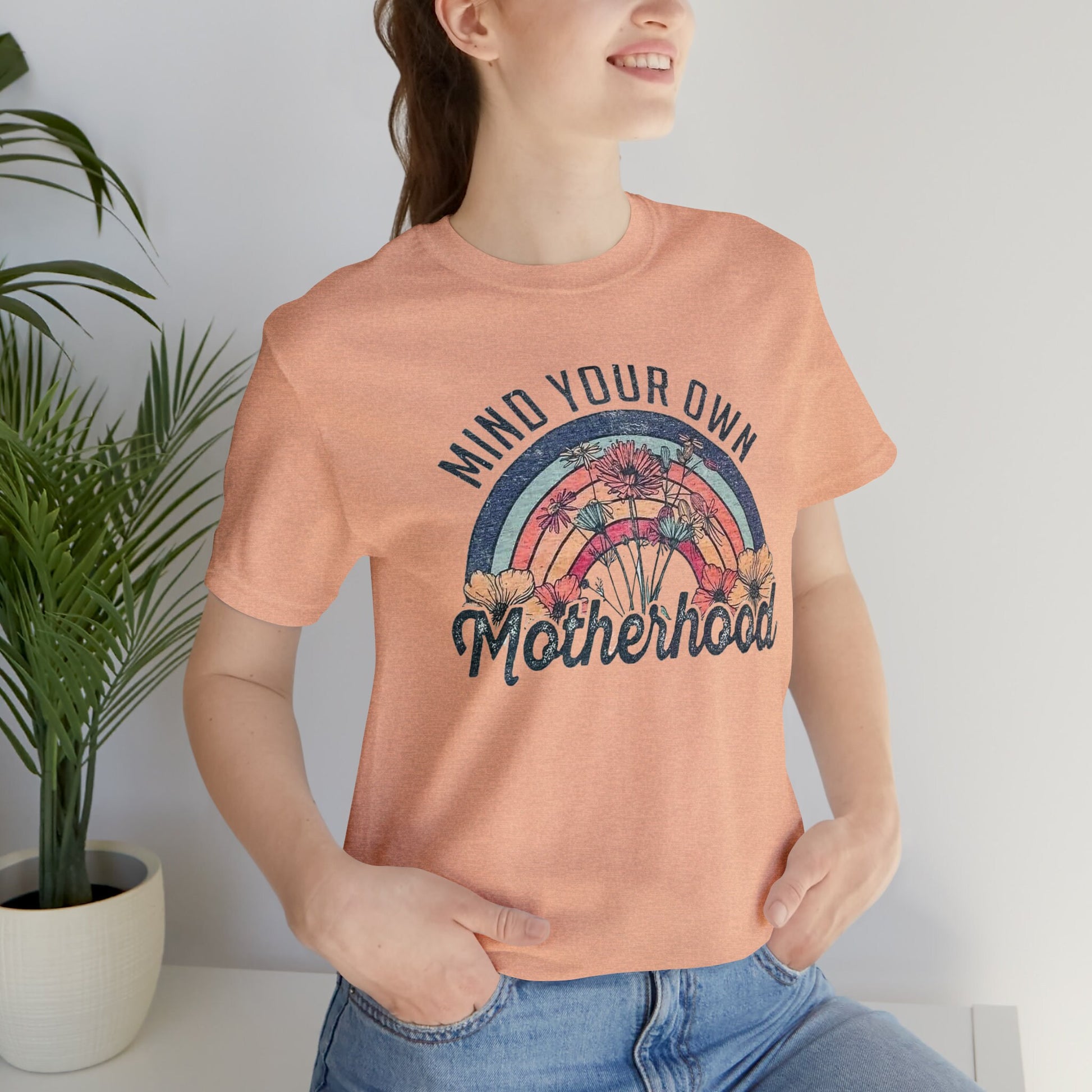 Introducing our "Mind Your Own Motherhood" T-shirt, a true embodiment of retro charm and empowerment. This eye-catching design showcases a delightful graphic of flowers and a rainbow, evoking a sense of joy and nostalgia. The carefully crafted aesthetic, combined with the bold slogan "Mind Your Own Motherhood," makes a powerful statement about embracing individuality and personal choices.