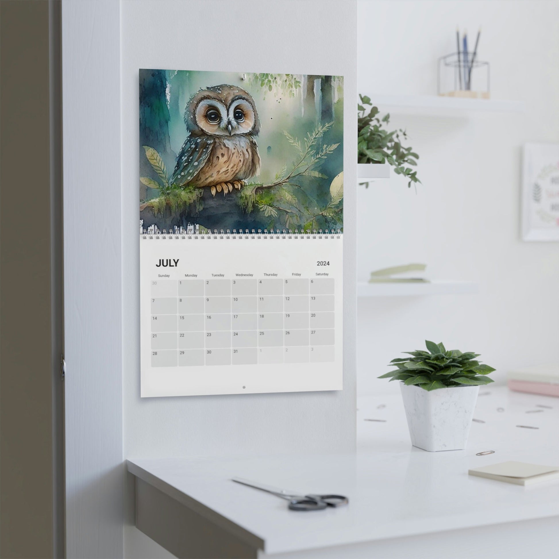 Our 2024 wall calendar featuring watercolor Owls in forest scenes is a delightful addition to any nature lover's collection. Each month showcases a unique and vibrant watercolor painting of an owl perched on a tree branch, nestled in a cozy nest or soaring through the forest. The beautiful forest backgrounds feature lush greenery, vibrant flowers, and towering trees, creating a serene and picturesque setting for the adorable owls. The calendar is not only functional, but it also adds a touch of whimsy and natural beauty to any room it is displayed in.