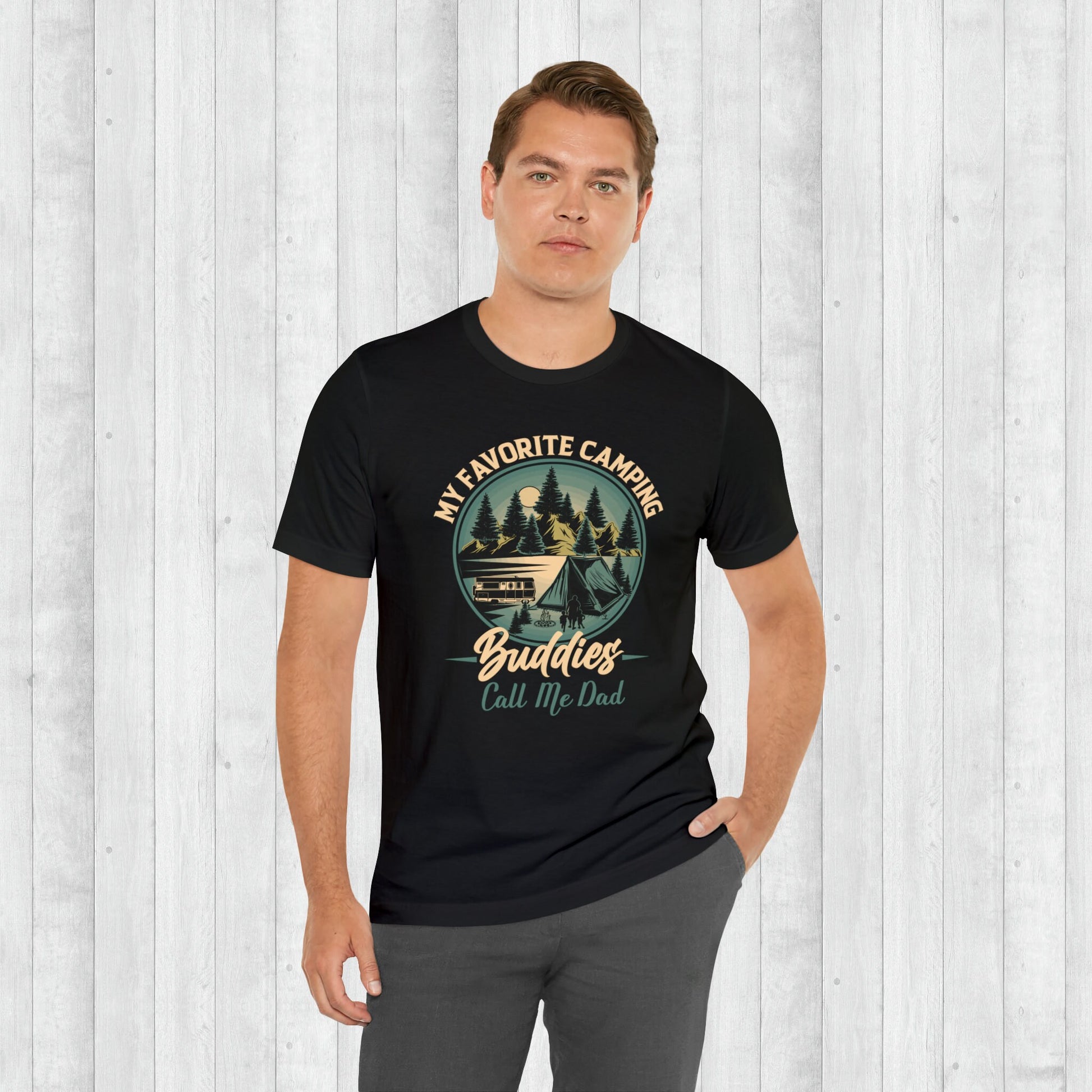 Experience the joy of the great outdoors with our adorable t-shirt featuring a picturesque campsite, towering trees, and majestic mountains in the distance. Designed to warm the hearts of dads everywhere, this shirt proudly displays the endearing slogan "My favorite camping buddies call me Dad." Crafted with care, it is available in sizes ranging from S to 3XL and comes in a selection of seven vibrant colors. Made from Airlume combed and ringspun cotton, this shirt guarantees utmost comfort and durability. Whether you're looking for a thoughtful gift or a personal addition to your wardrobe, this charming t-shirt is a perfect choice for any father who treasures the precious memories created during family camping adventures.