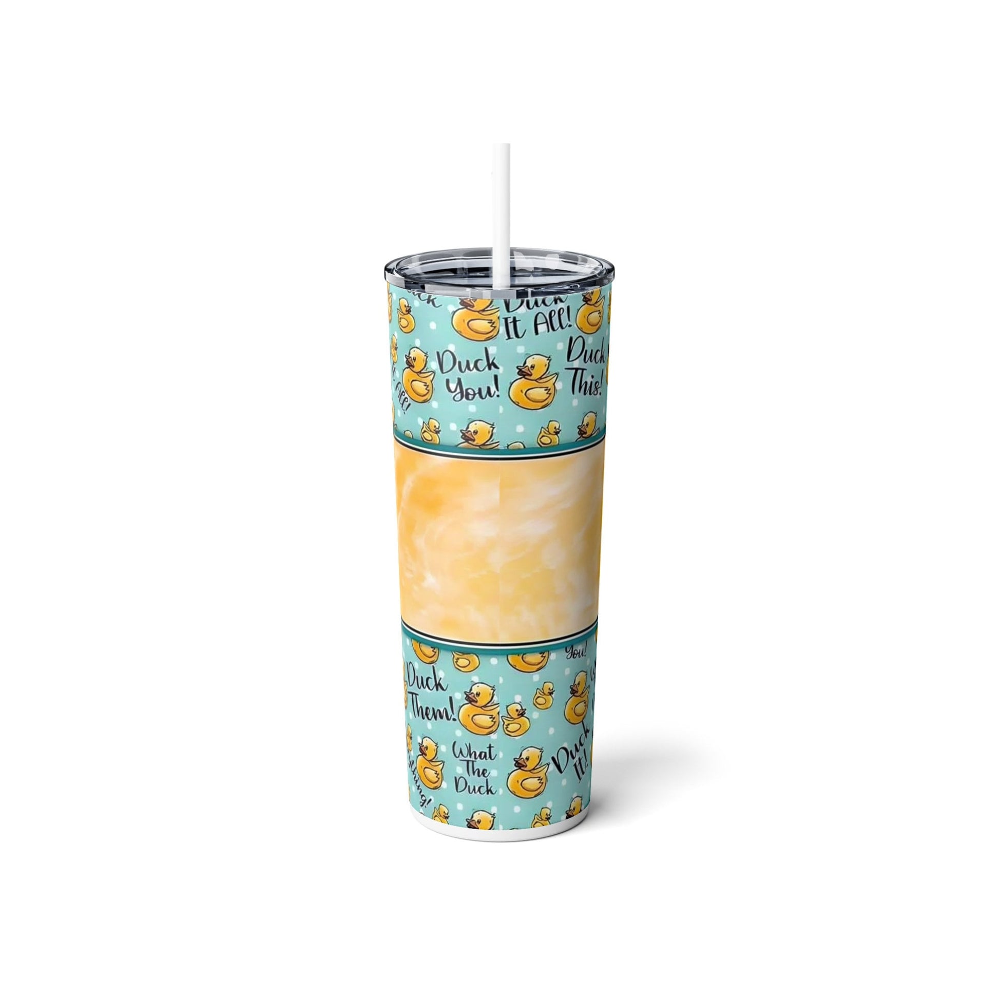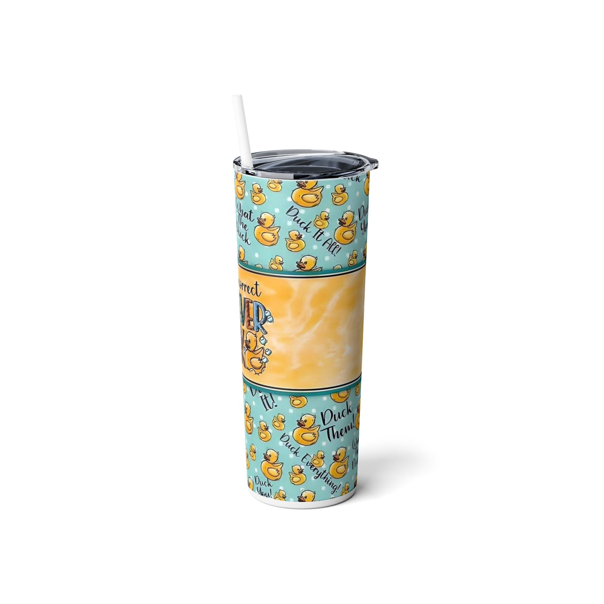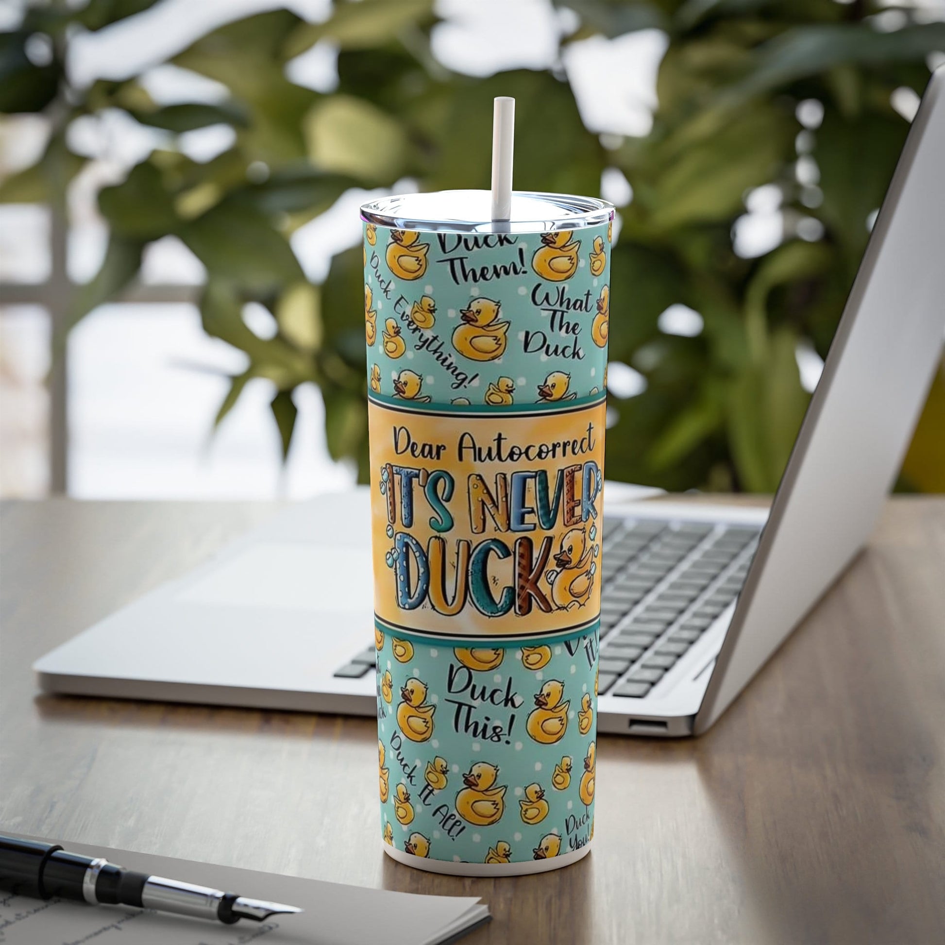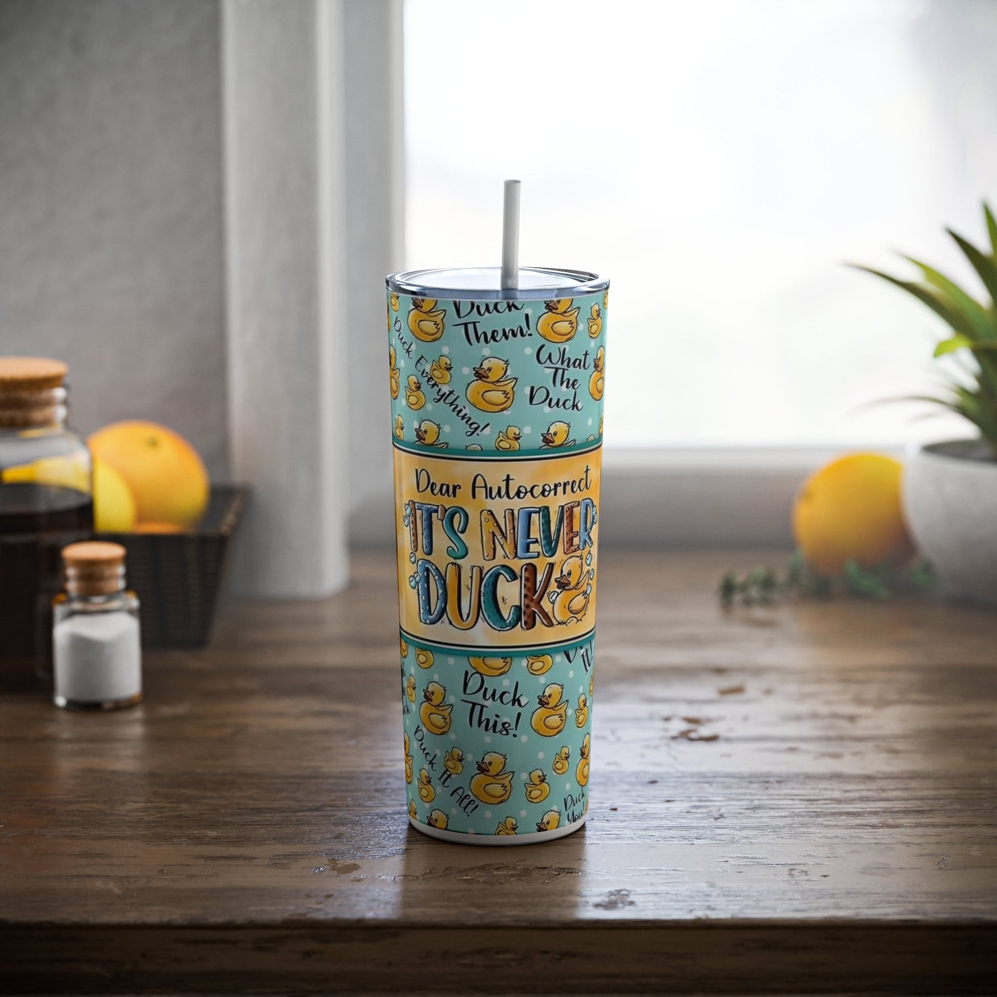 This tumbler is a must-have for anyone with a sense of humor and a love for quirky designs. Whether you're a victim of autocorrect blunders or simply enjoy lighthearted fun, this tumbler will surely brighten your day. It's an excellent conversation starter and a great gift for friends, colleagues, or family members who appreciate a good laugh. Carry it with you to work, school, or outings, and let the amusing rubber ducks and clever phrases spark joy and laughter wherever you go. With its high-quality construction and playful design, this Reusable Skinny Stainless Steel Tumbler is the perfect blend of practicality and entertainment, making it a delightful addition to your daily routine.