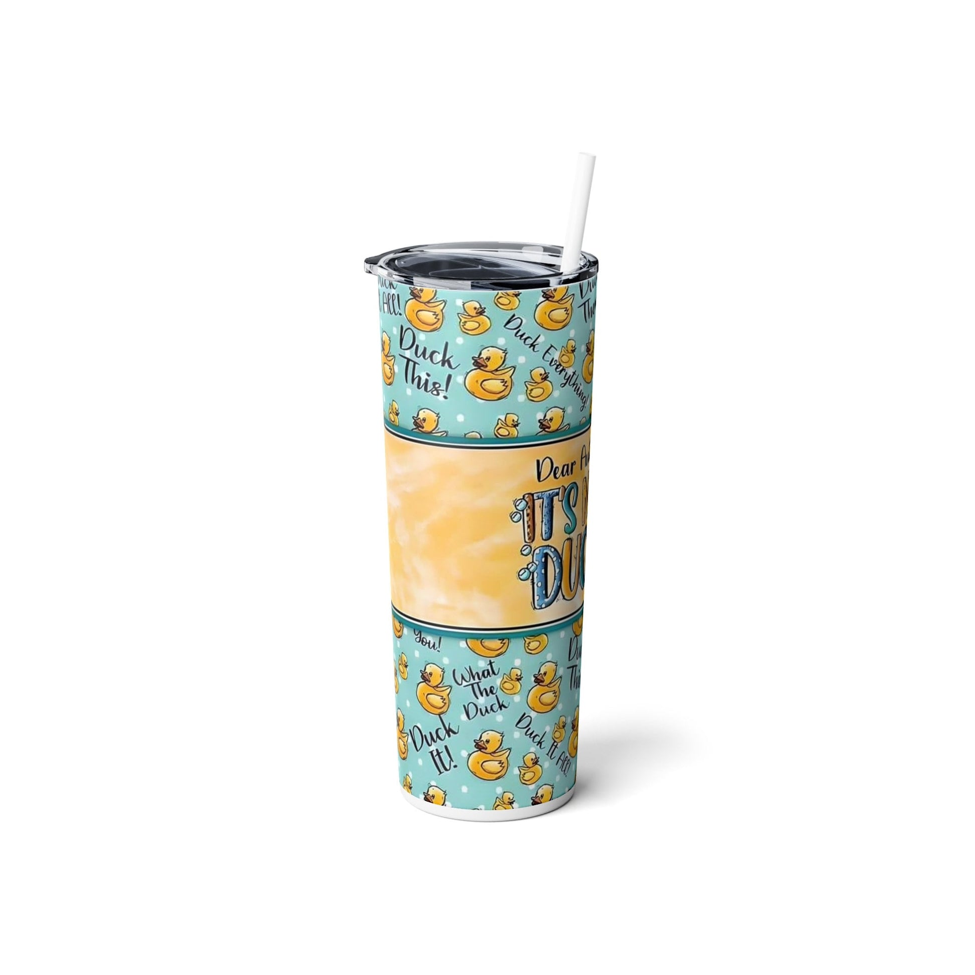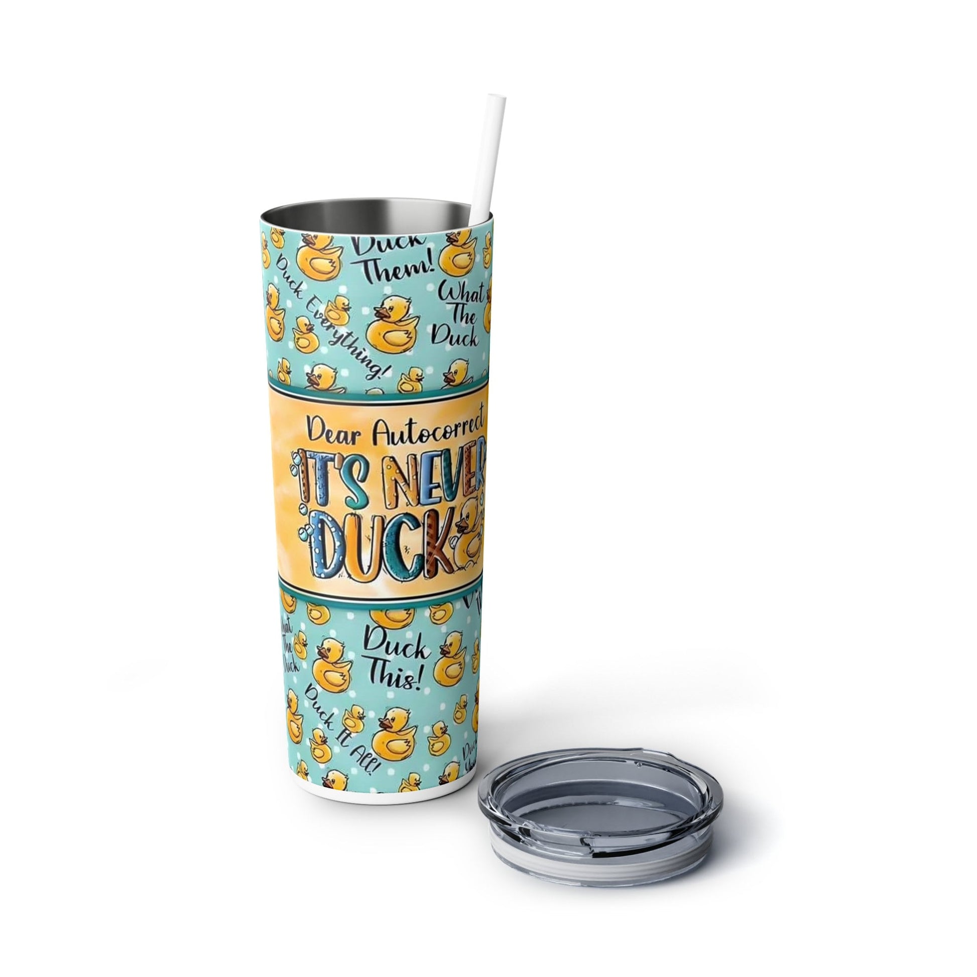Introducing our latest must-have tumbler, the Reusable "It's Never Duck" Skinny Stainless Steel Tumbler! Sip in style and embrace the humorous side of autocorrect mishaps with its hilarious design that playfully declares, "Dear Autocorrect, it's never duck." Adorned with a delightful array of rubber ducks and witty phrases like "What the Duck" and "Duck This," this tumbler is guaranteed to bring a smile to your face with every sip. Crafted from premium stainless steel, this tumbler holds a generous 20 ounces of your favorite beverage, keeping it hot or cold for hours. Its sleek and slender design fits perfectly in your hand, while the BPA-free plastic lid and straw provide convenience and durability.